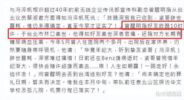 与其相识40年的曾醒明表示:昨晚10时许(10月31号晚),于台北市林口离世。