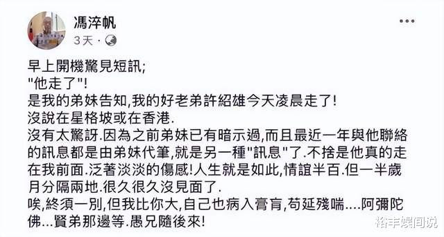 28号,黎芷珊官宣许绍雄去世消息的时候,冯淬帆曾发文悼念:贤弟那边等,愚兄随后来。
